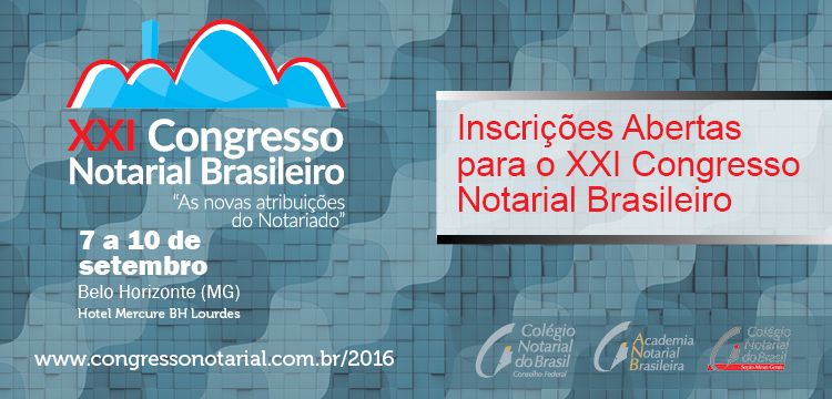 O Conselho Federal do Colégio Notarial do Brasil (CNB-CF) realizará, entre os dias 7 e 10 de setembro de 2016, em parceria com a Seccional de Minas Gerais (CNB-MG), o Congresso Notarial Brasileiro, na cidade de Belo Horizonte (MG).