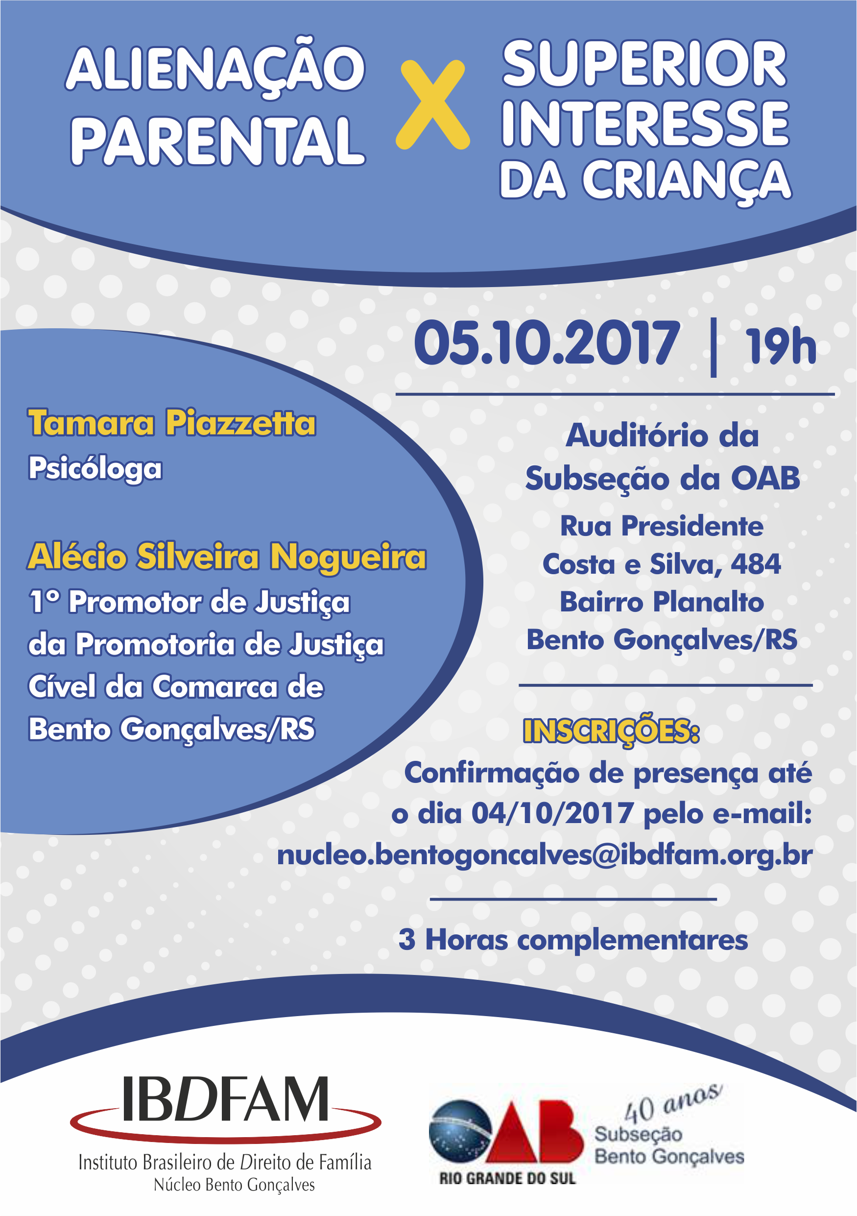 Confirmação de presença até o dia 04/10/2017 pelo email: nucleo.bentogoncalves@ibdfam.org.br