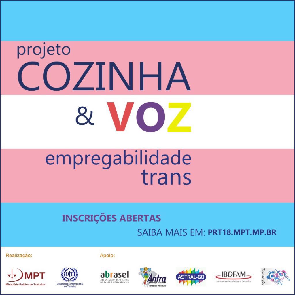 Projeto “Empregabilidade Trans - Cozinha e Voz” está com inscrições abertas até 30 de agosto. Siba mais:http://prt18.mpt.mp.br/informe-se/noticias-do-mpt-go/448-mpt-go-oferece-oportunidade-de-formacao-profissional-para-transexuais-e-travestis