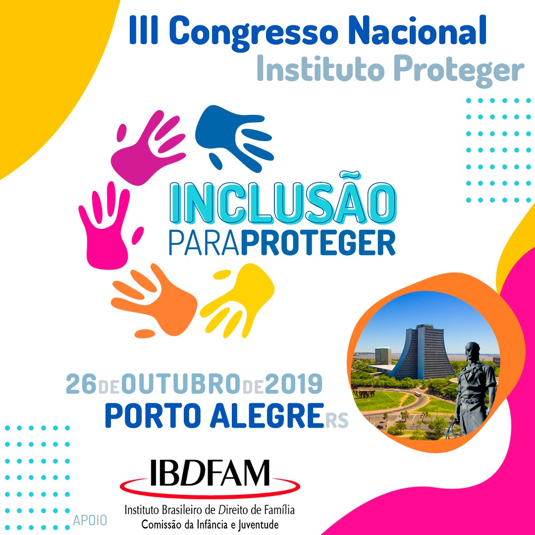 Em 26 de outubro de 2019, o Instituto Proteger irá promover seu III Congresso Nacional, com apoio da Comissão Nacional da Infância e Juventude do IBDFAM, e o foco será desenvolver o tema da inclusão de crianças, adolescentes, jovens e idosos com deficiência.