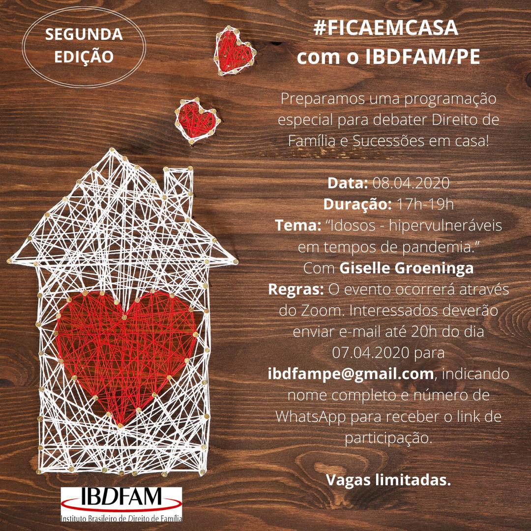 A transmissão, que será ministrada por Giselle Groeninga, ocorrerá através da plataforma Zoom. Para se inscrever, envie um e-mail para ibdfampe@gmail.com indicando nome completo e número de WhatsApp para receber o link de participação.