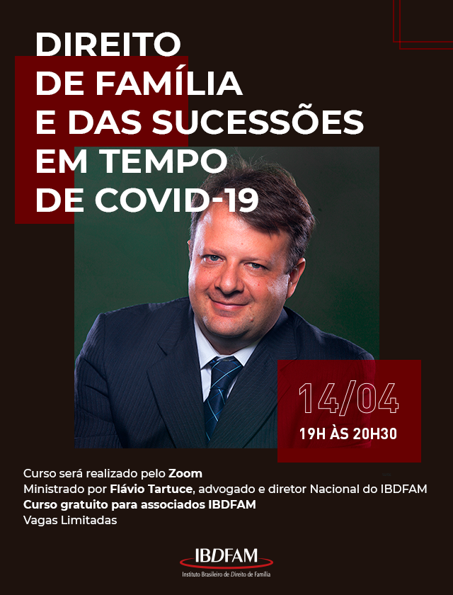 Realizado por meio da plataforma Zoom, o curso será ministrado por Flávio Tartuce, advogado e diretor nacional do IBDFAM. Gratuito para associados IBDFAM.