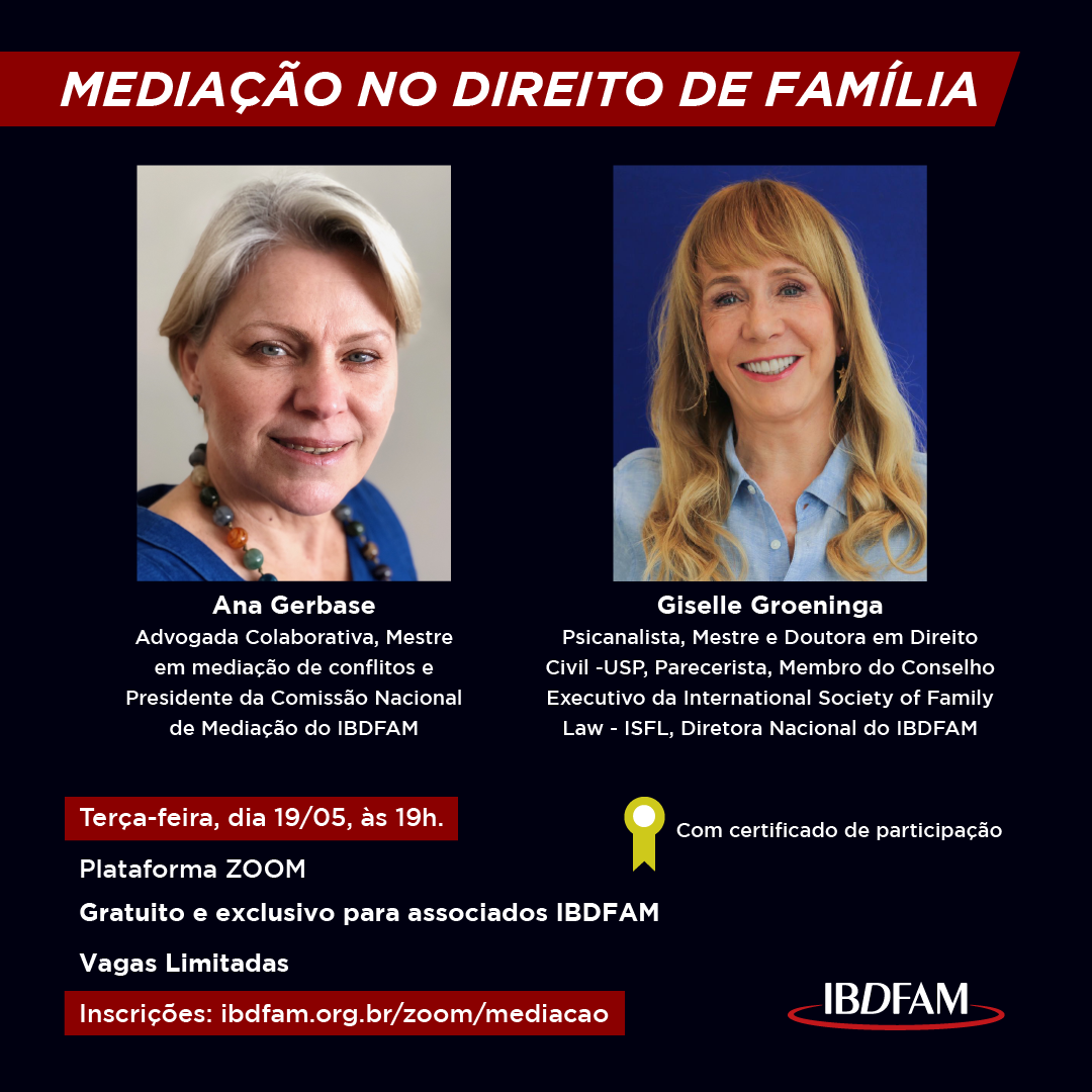 Com Ana Gerbase, Advogada Colaborativa, Mestre em mediação de conflitos e Presidente da Comissão Nacional de Mediação do IBDFAM e Giselle Groeninga, Psicanalista, Mestre e Doutora em Direito Civil -USP, Parecerista, Membro do Conselho Executivo da International Society of Family Law -ISFL, Diretora Nacional do IBDFAM.