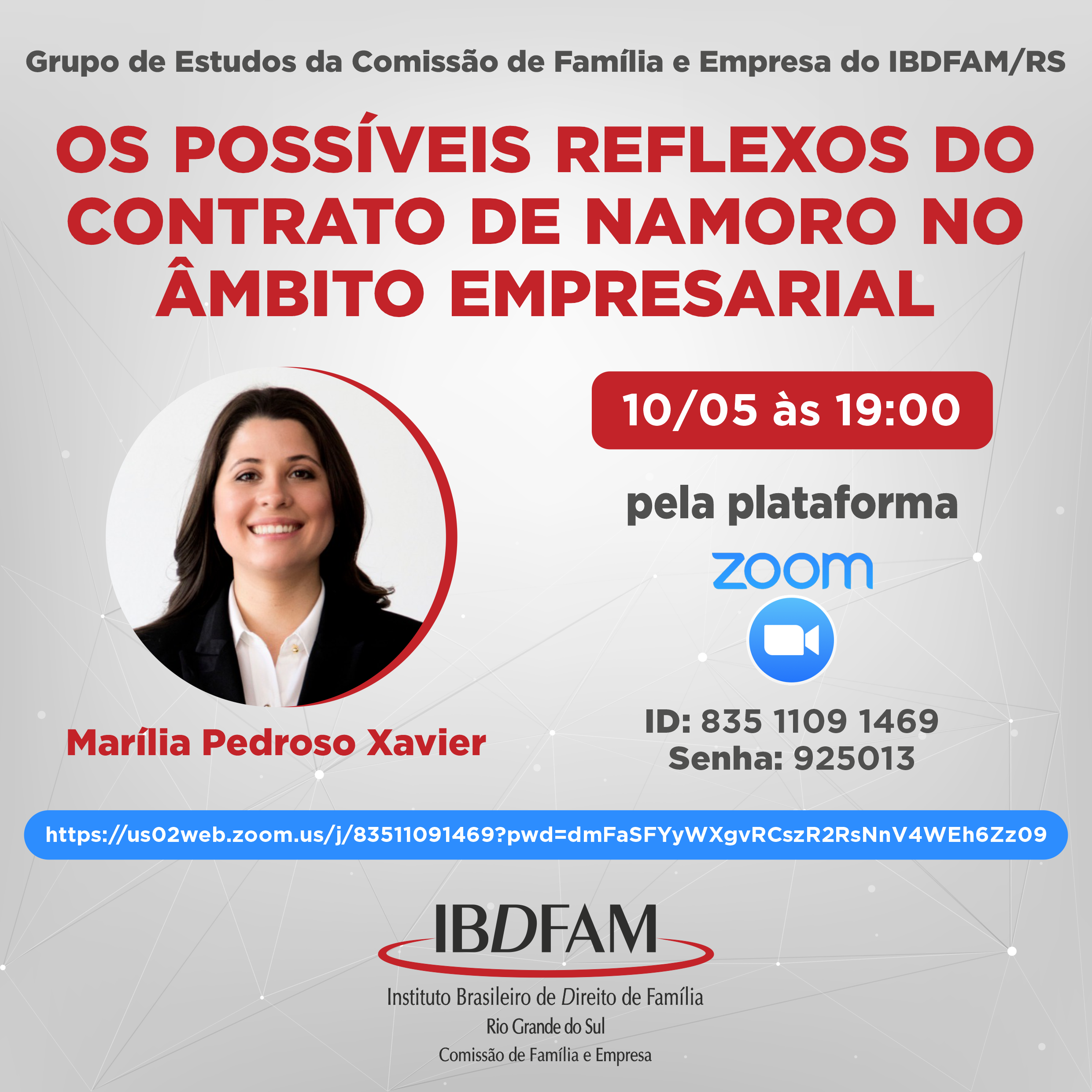 Evento do Grupo de Estudos Comissão de Família e Empresa do IBDFAM-RS será realizado às 19h, por meio da plataforma Zoom. Com Marília Pedroso Xavier. ID da reunião: 835 1109 1469; Senha: 925013.