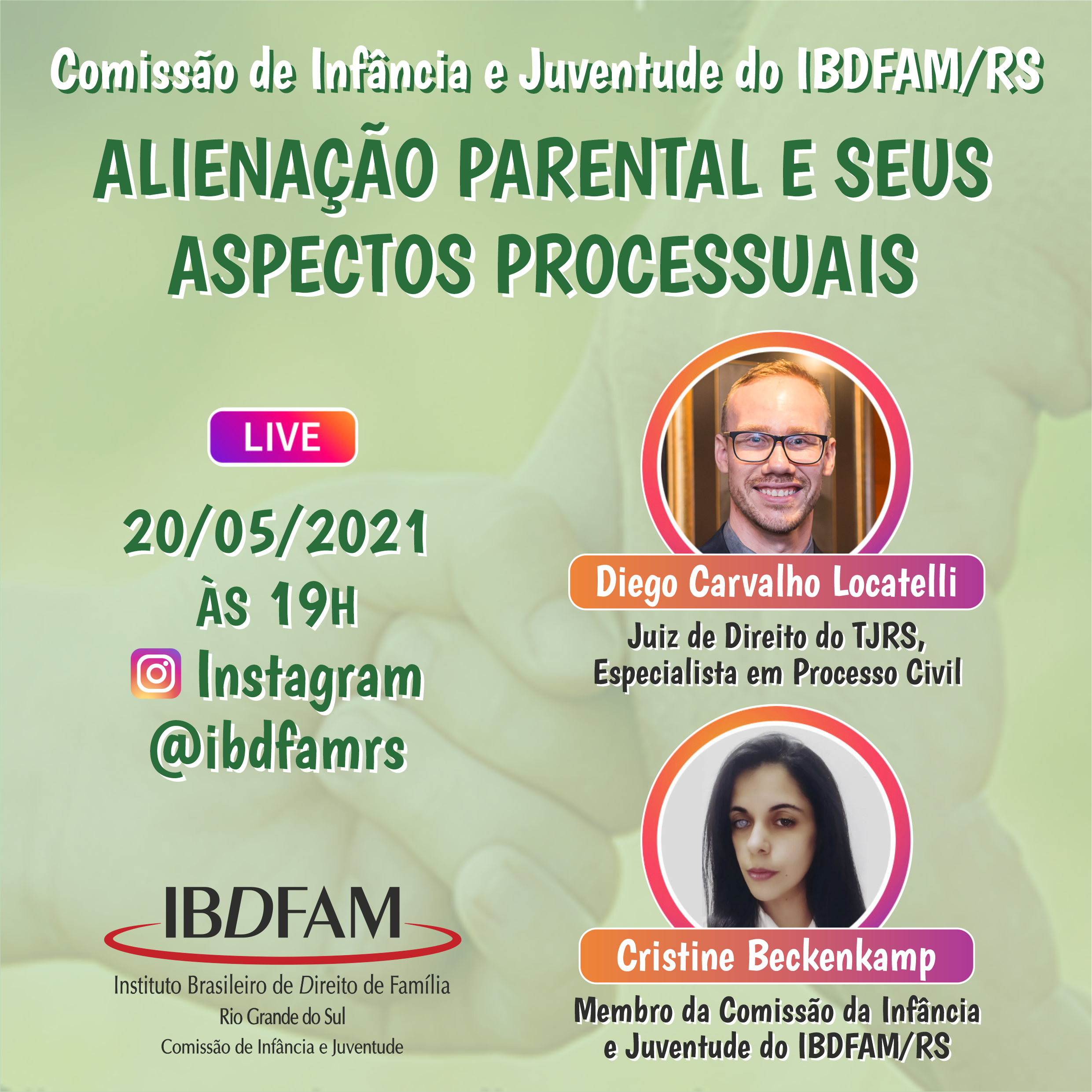 Live promovida pela Comissão da Infância e Juventude do IBDFAM-RS no Instagram (@ibdfamrs), a partir das 19h, Com Diego Carvalho Locatelli, juiz de Direito do TJRS, e Cristine Beckenkamp, membro da Comissão da Infância e Juventude do IBDFAM-RS.