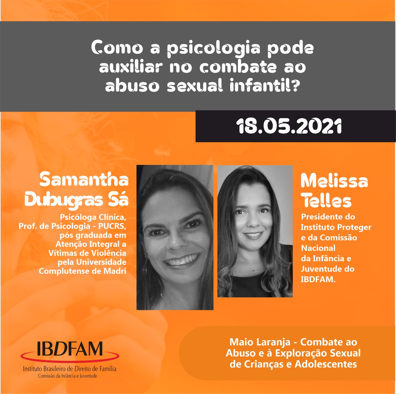 A Comissão da Infância e Juventude do IBDFAM realiza no Instagram, por meio do perfil @infanciaejuventudeibdfambrasil, sempre às 19h, lives dedicadas ao Maio Laranja, de combate aos abusos e à exploração sexual de crianças e adolescentes.