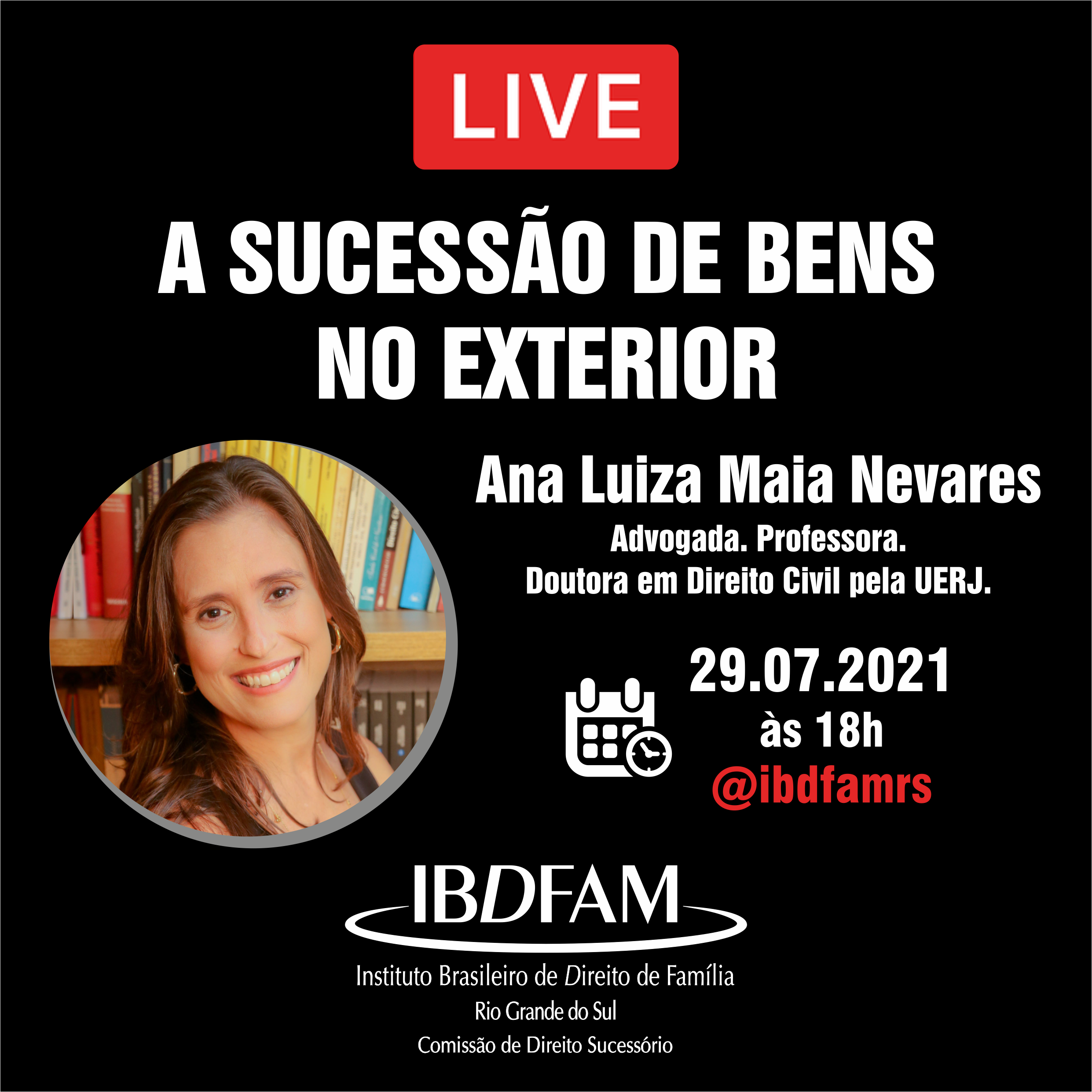 Transmissão ao vivo pelo perfil do @ibdfamrs no Instagram, às 18h. Com a advogada  Ana Luiza Maia Nevares.
