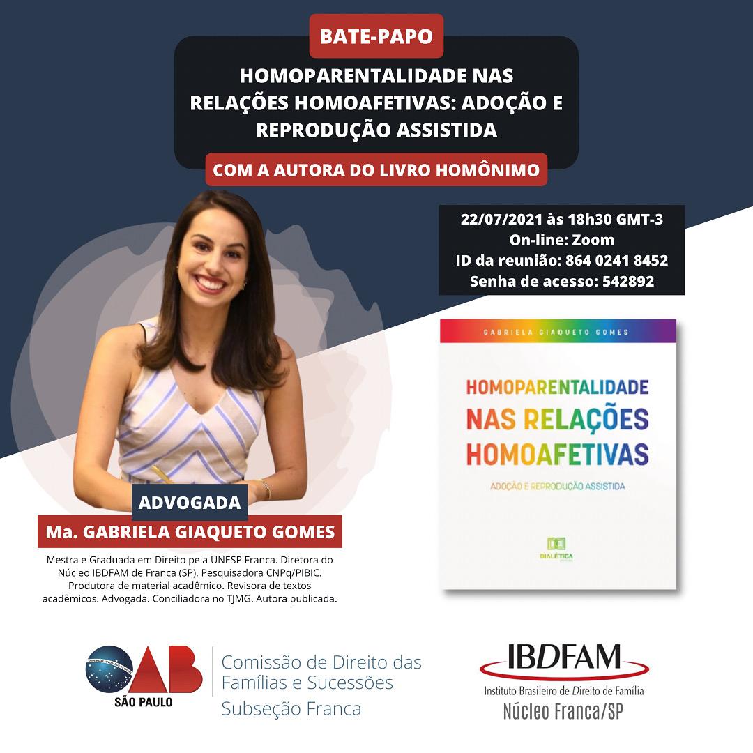 Bate-papo será realizado às 18h30, por meio da plataforma Zoom. Com a advogada Gabriela Giaqueto Gomes, diretora do Núcleo de Franca do Instituto Brasileiro de Direito de Família - IBDFAM e autora do livro "Homoparentalidade nas relações homoafetivas: adoção e reprodução assistida".