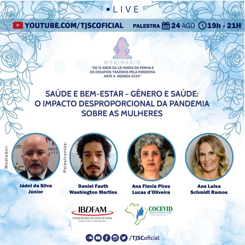 Live das 19h às 21h integra Webinário sobre os 15 anos da Lei Maria da Penha. Mediador: Jádel da Silva Junior. Palestrantes: Daniel Fauth Washington Martins, Ana Flavia Pires Lucas d'Oliveira e Ana Luisa Schmidt Ramos. Acompanhe em youtube.com/tjscoficial.