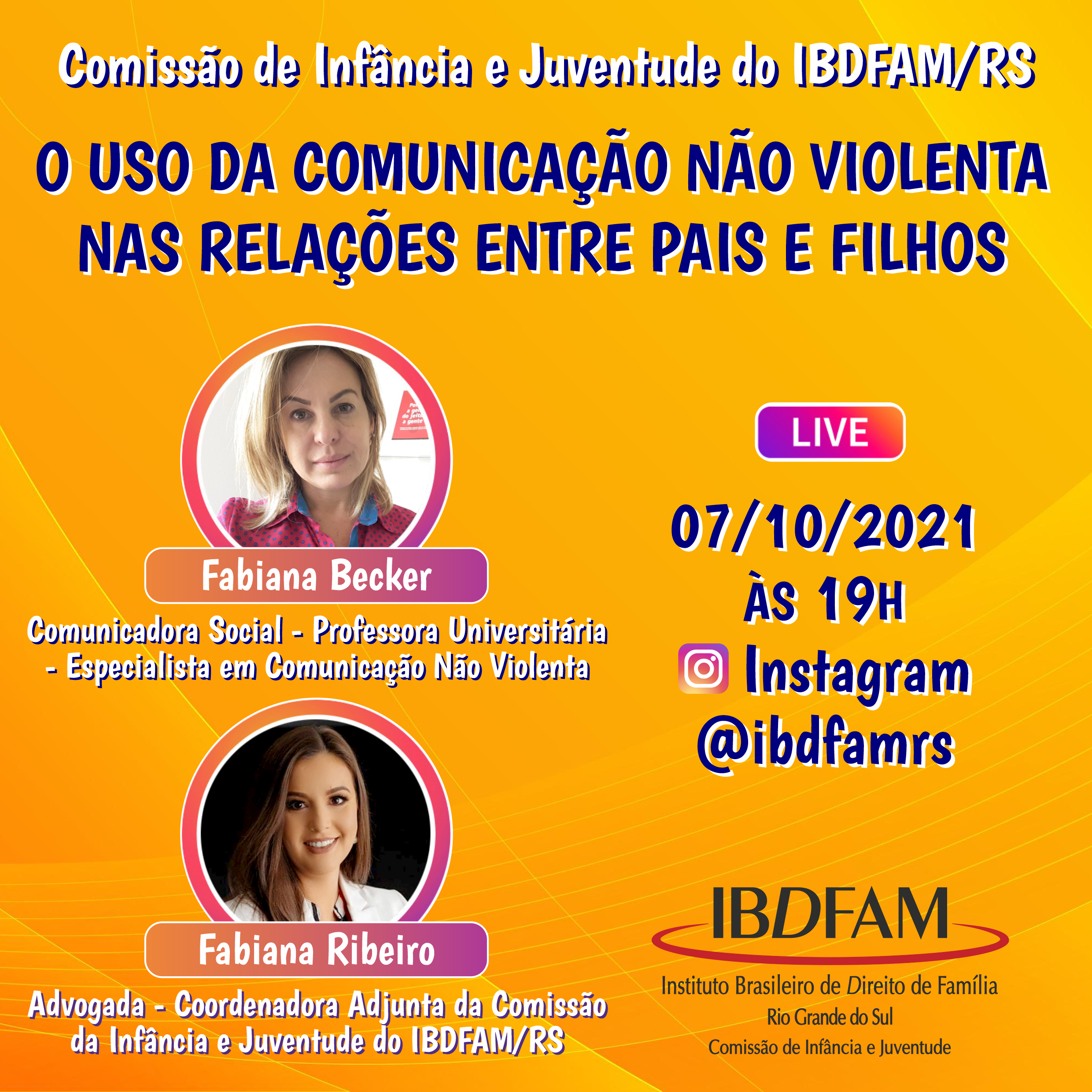Live transmitida pelo perfil do @ibdfamrs no Instagram, às 19h. Com a professora Fabiana Becker e a advogada Fabiana Ribeiro.