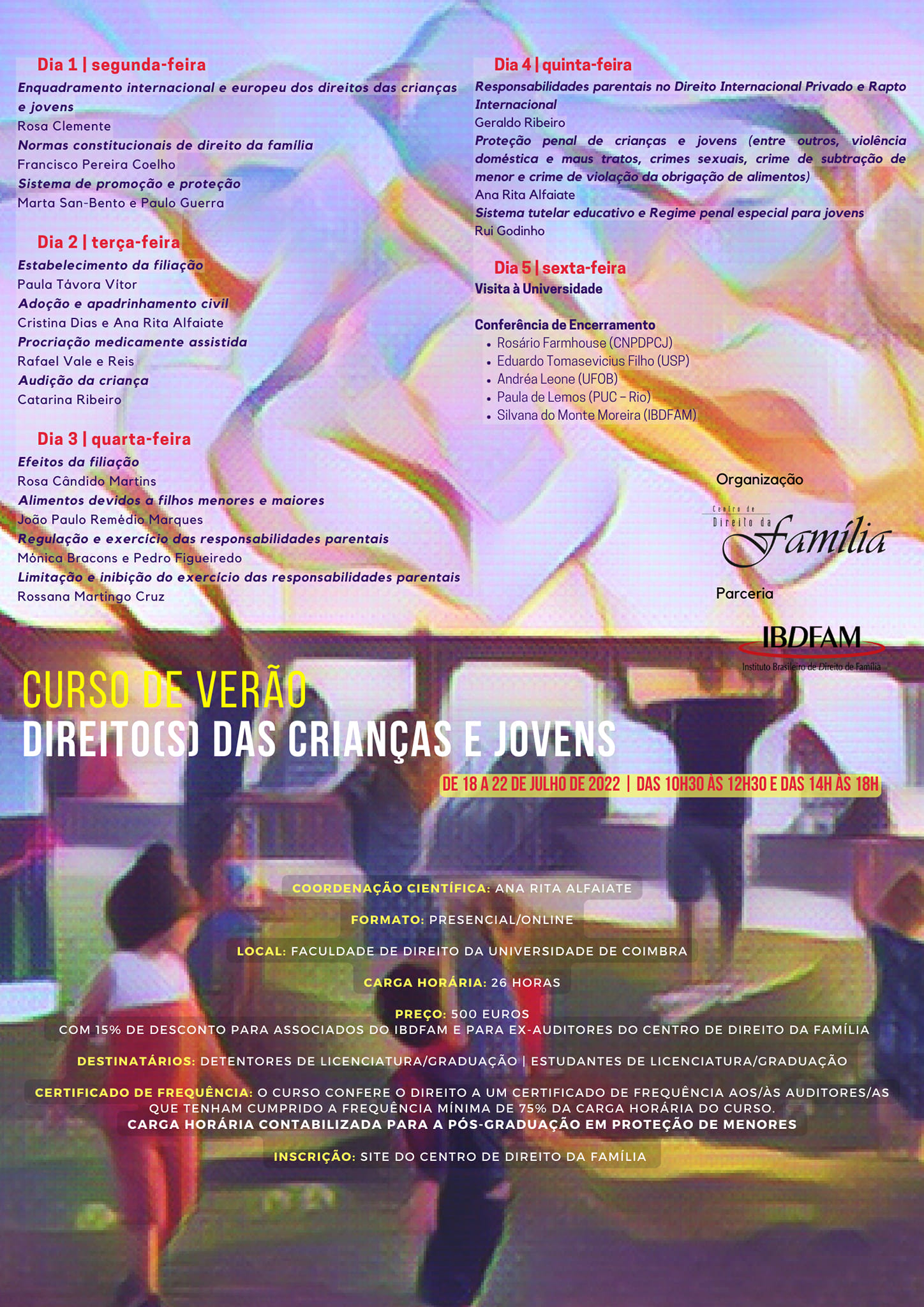 Inscrições: https://www.centrodedireitodafamilia.org/curso/cursos-de-ver%C3%A3o/direitos-das-crian%C3%A7as-e-jovens