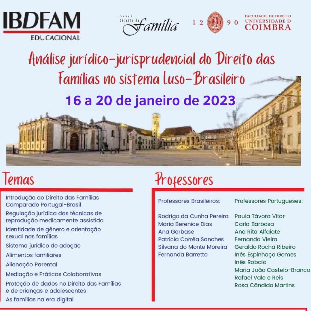 O curso será ministrado em conjunto com professores portugueses e brasileiros. Haverá certificação. Inscrições abertas. Associados ao IBDFAM têm desconto.