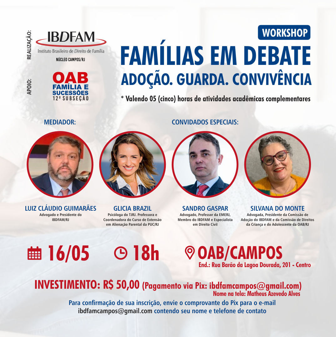 Investimento: R$ 50. Para confirmar a inscrição, envie o comprovante do pix para o e-mail ibdfamcampos@gmail.com, com nome e telefone para contato.