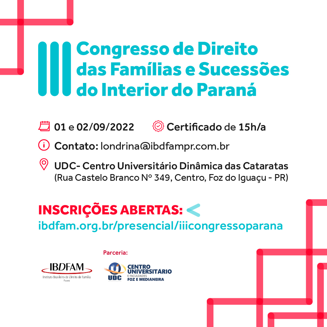 Inscrições: https://ibdfam.org.br/presencial/iiicongressoparana/