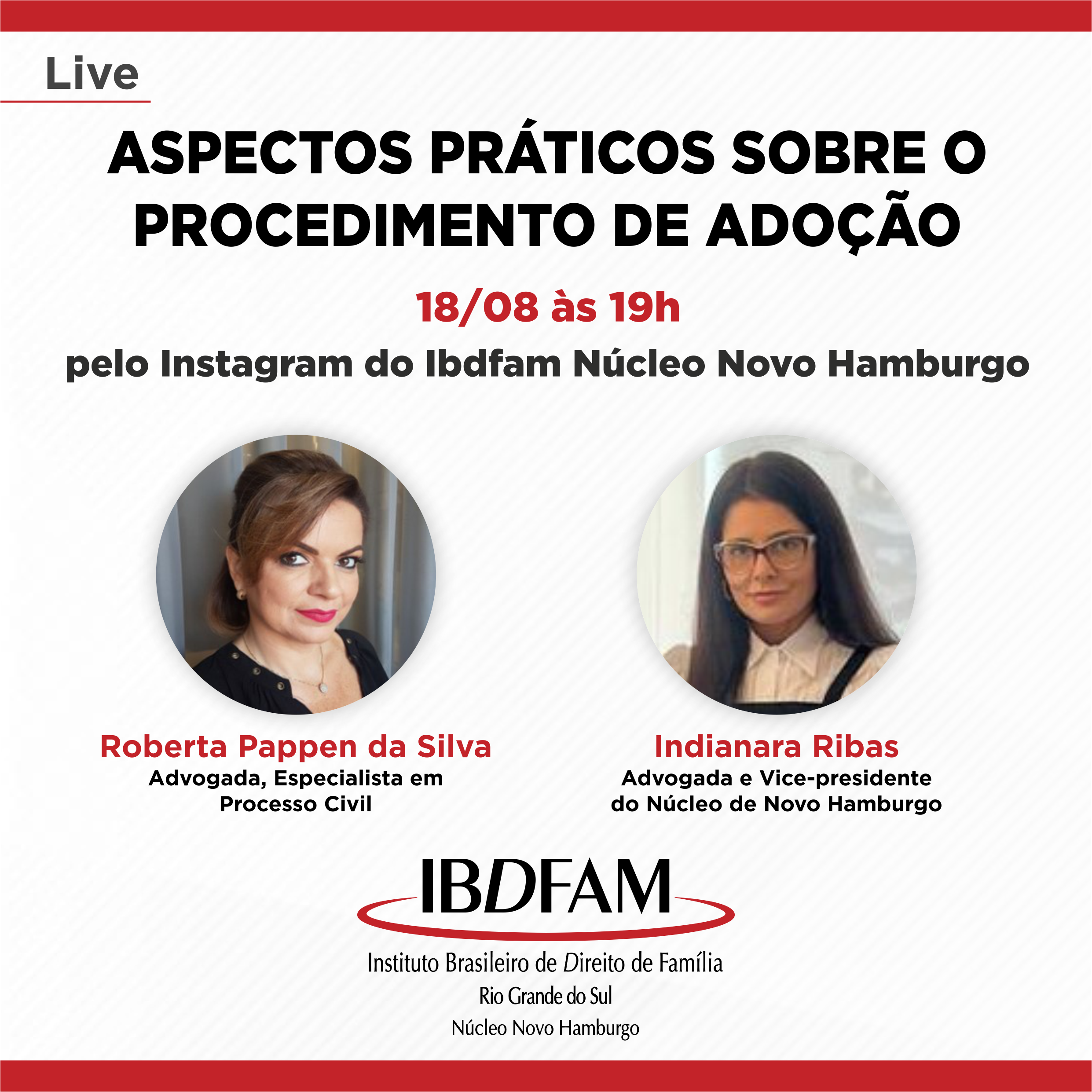 Transmissão ao vivo por meio do Instagram do Núcleo do IBDFAM Novo Hamburgo @ibdfamnh. Com as advogadas Roberta Pappen da Silva e Indianara Ribas.