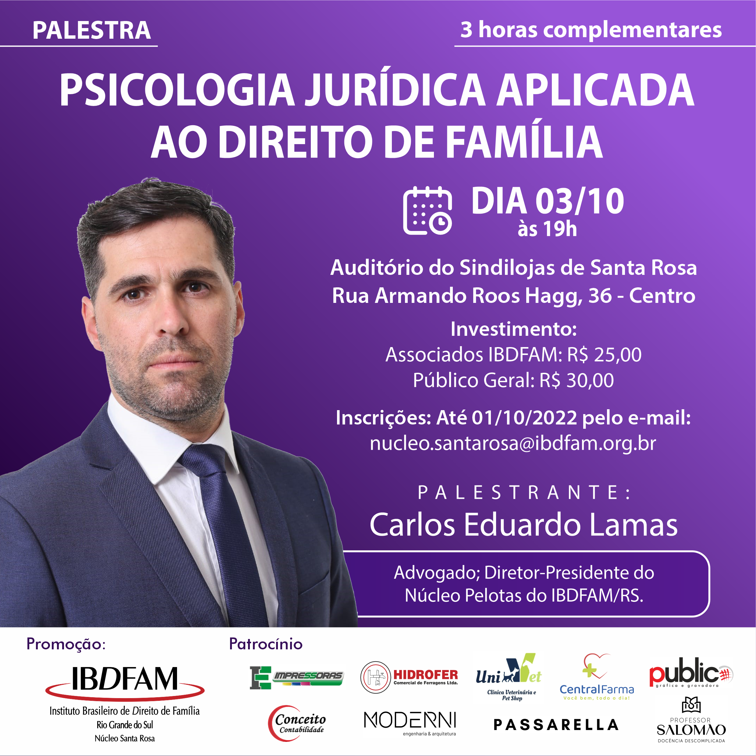 Evento presencial será realizado às 19h, no auditório do Sindilojas de Santa Rosa (Rua Armando Roos Hagg, 36, Centro de Santa Rosa - RS). Com o advogado Carlos Eduardo Lamas, diretor-presidente do Núcleo Pelotas do IBDFAM-RS. As inscrições podem ser feitas até 01/10 pelo e-mail: nucleo.santarosa@ibdfam.org.br.
