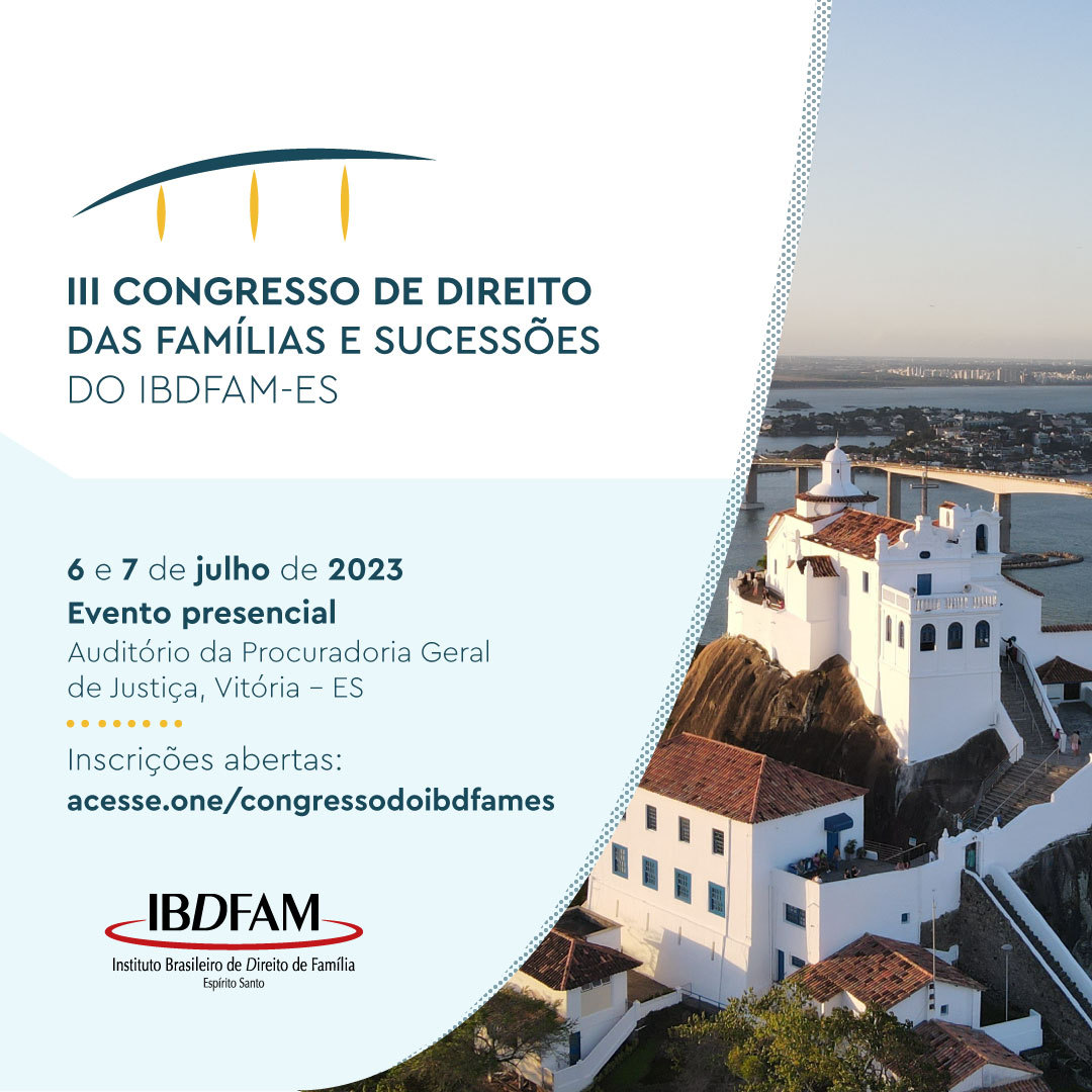 Inscrições: https://www.sympla.com.br/evento/iii-congresso-do-ibdfam-es/1901314?share_id=4fcqh
