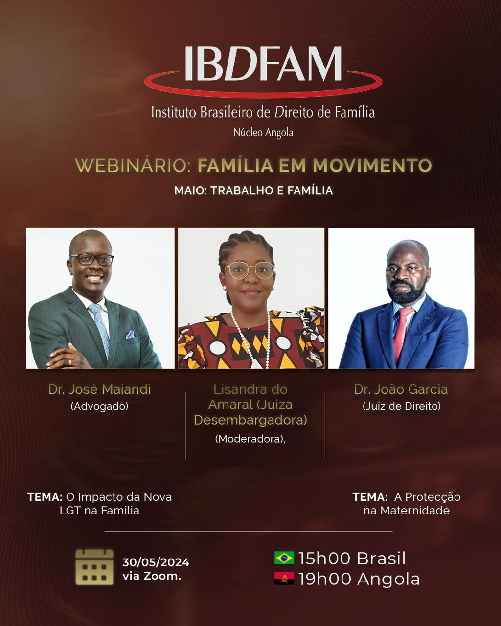 O evento, organizado pelo Núcleo Angola do IBDFAM, acontece às 15h do Brasil e às 19h de Angola, via Zoom.
