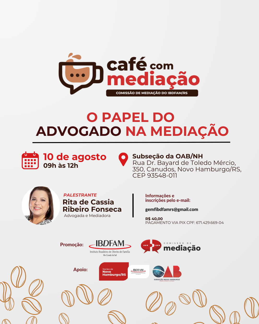 O evento, promovido pela Comissão de Mediação do IBDFAM-RS, acontece das 9h às 12h, na Subseção da OAB/NH (Rua Dr. Bayard de Toledo Mércio, 350, Canudos, Novo Hamburgo - RS).