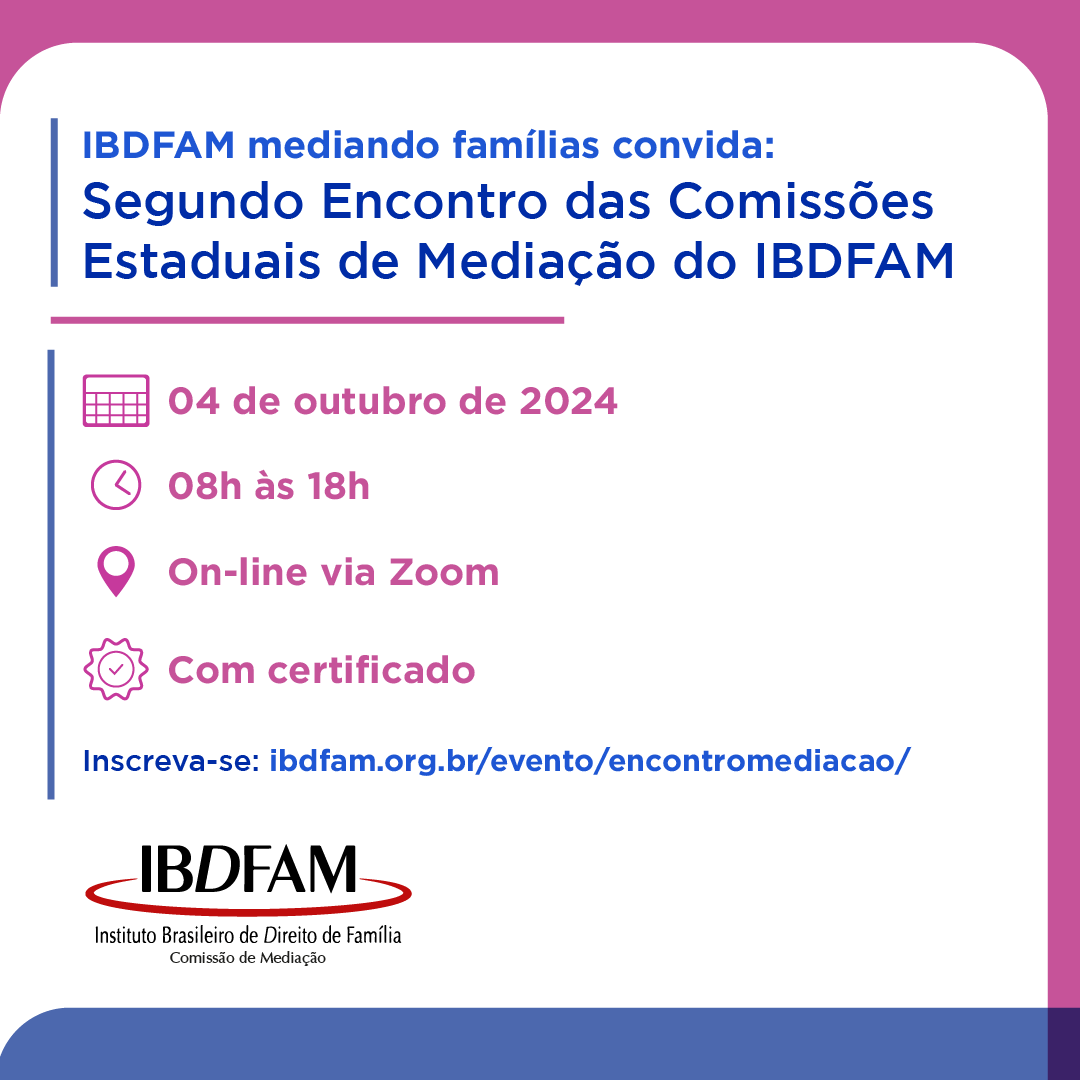 Inscrições: https://ibdfam.org.br/evento/encontromediacao/