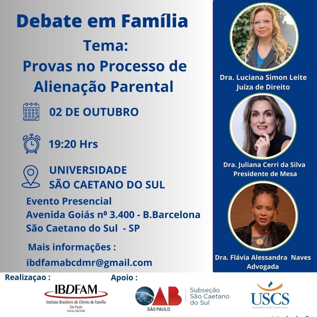 O evento, realizado pelo Núcleo ABCDMR do IBDFAM-SP, acontece às 19h20, na Universidade São Caetano do Sul (Avenida Goiás, 3.400, Bairro Barcelona, São Caetano do Sul, SP).