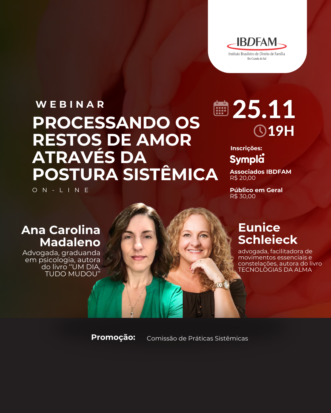 O encontro on-line, promovido pela Comissão de Práticas Sistêmicas do IBDFAM-RS, será realizada as 19h.