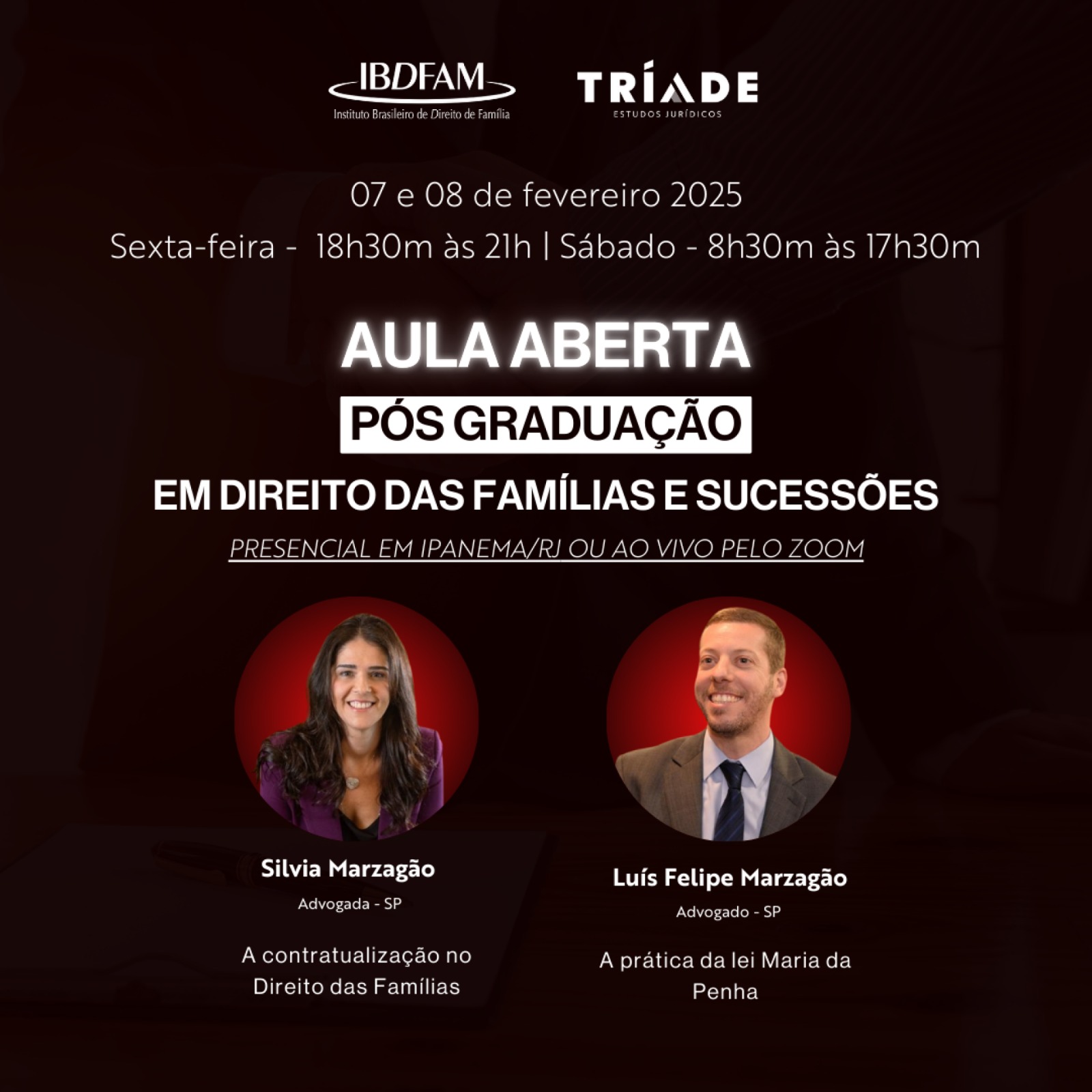 Inscrições: https://www.cursotriade.com.br/aula-aberta-pos-graduacao-em-direito-das-familias-e-sucessoes-rj-20251/2028