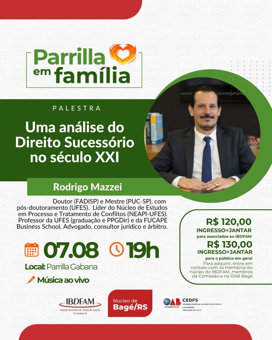 A palestra, promovida pelo núcleo Bagé do IBDFAM-RS, acontece às 19h, no Parrilla Gabana, em Bagé, no Rio Grande do Sul.