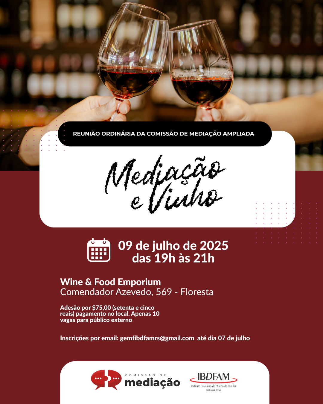O evento, promovido pela Comissão de Mediação do IBDFAM-RS, acontece das 19h às 21h, no Wine & Food Emporium (R. Comendador Azevedo, 569, Floresta, Porto Alegre, RS).