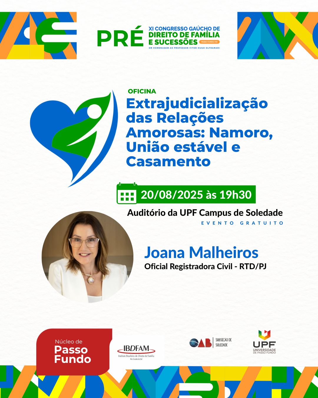 A oficina gratuita, promovida pela Comissão de Direito Notarial e Registral do IBDFAM-RS, acontece às 19h30, Auditório da Universidade de Passo Fundo – UPF Campus Soledade (Av. Mal. Floriano Peixoto - Botucaraí, Soledade, RS).