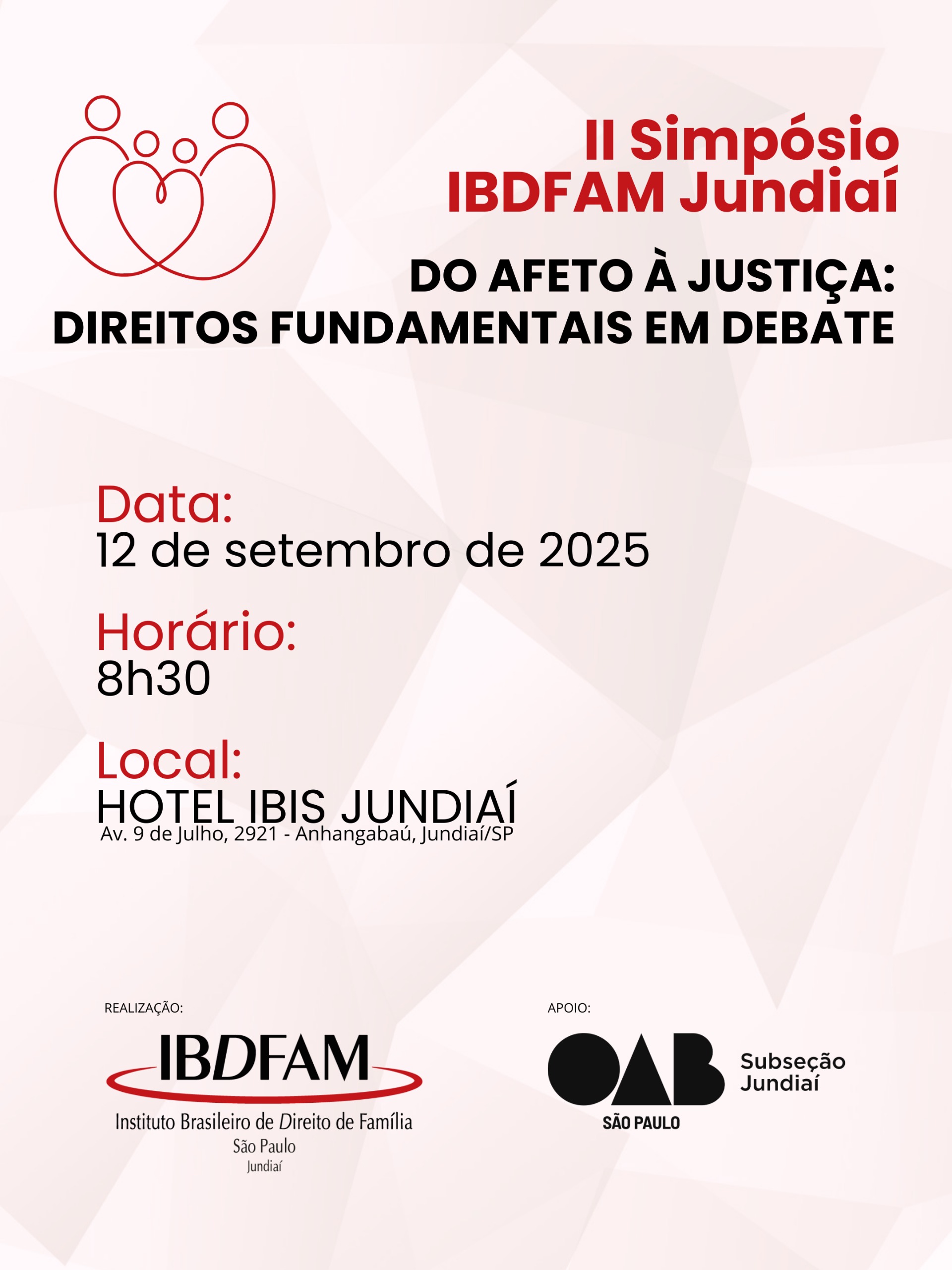 O simpósio, promovido pelo núcleo Jundiaí do IBDFAM-SP, acontece a partir das 8h às 17h30, no Hotel Ibis Jundiaí (Av. 9 de Julho, 2921, Anhangabaú, Jundiaí, SP).