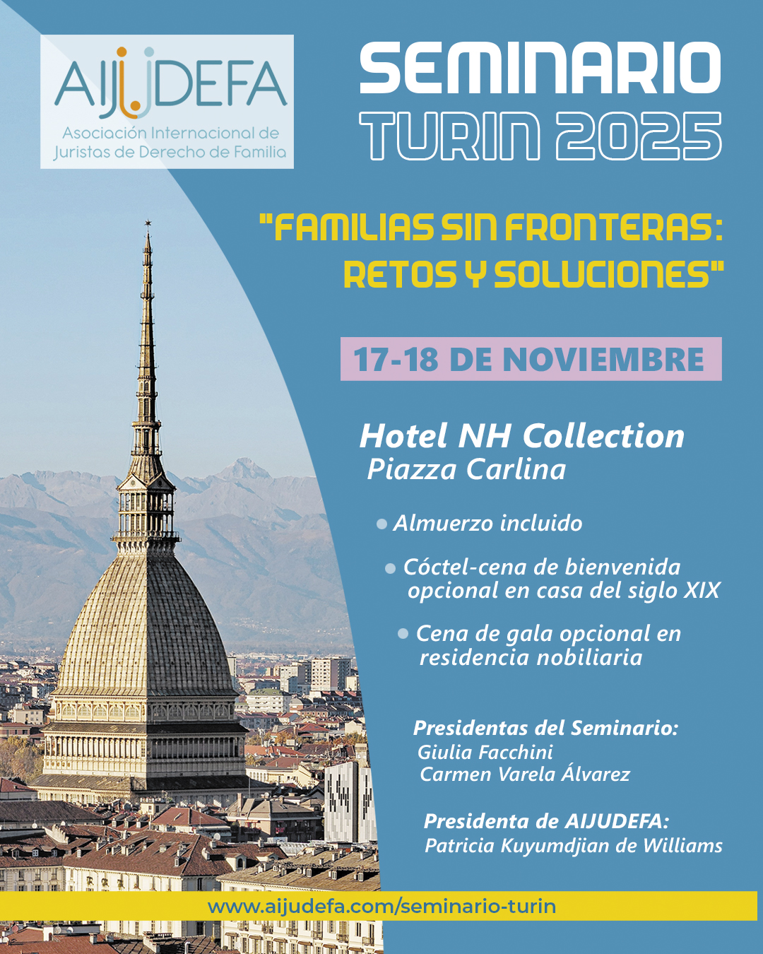 O seminário, promovido pela Asociación Internacional de Juristas de Derecho de Familia – AIJUDEFA, acontece no dia 17 e 18 de novembro, no Hotel NH Collection Torino Piazza Carlina, em Turim, na Itália.