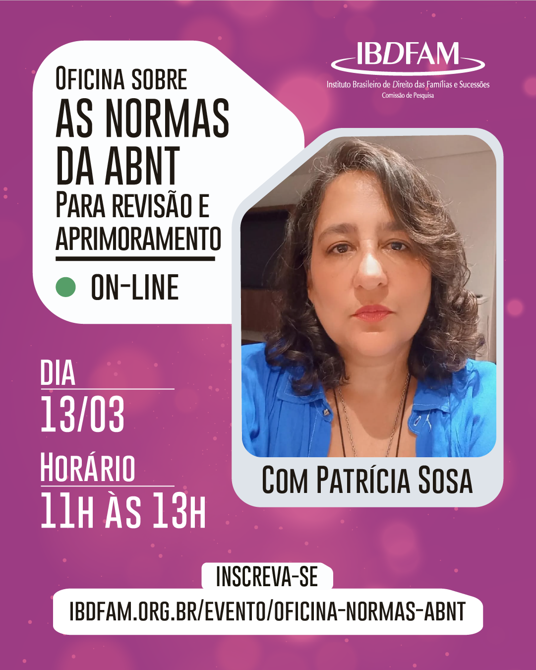 Inscrições: https://ibdfam.org.br/evento/oficina-normas-abnt/