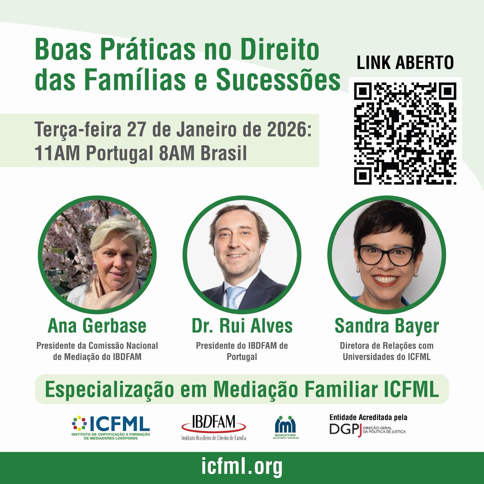 A especialização em mediação familiar – ICFML será realizada em 27 de janeiro, on-line. O evento acontece às 8h do Brasil e 11h de Portugal. Com Ana Gerbase, Rui Alves e Sandra Bayer. Participe!