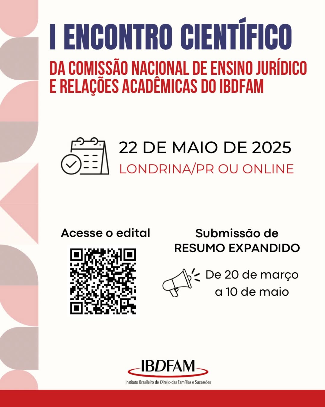 A Comissão Nacional de Ensino Jurídico e Relações Acadêmicas do IBDFAM convida a comunidade acadêmica a participar do I Encontro Científico, que será realizado no dia 22 de maio, na Universidade Estadual de Londrina – UEL.