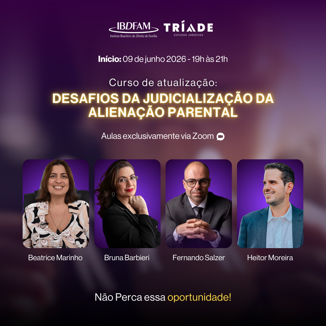 O curso on-line, promovido pela Tríade Estudos Jurídicos em parceria com o IBDFAM, acontece a partir de 9 de junho, das 19h às 21h, via Zoom. Ao todo, serão cinco encontros ao vivo, com aulas interativas e aprofundadas.