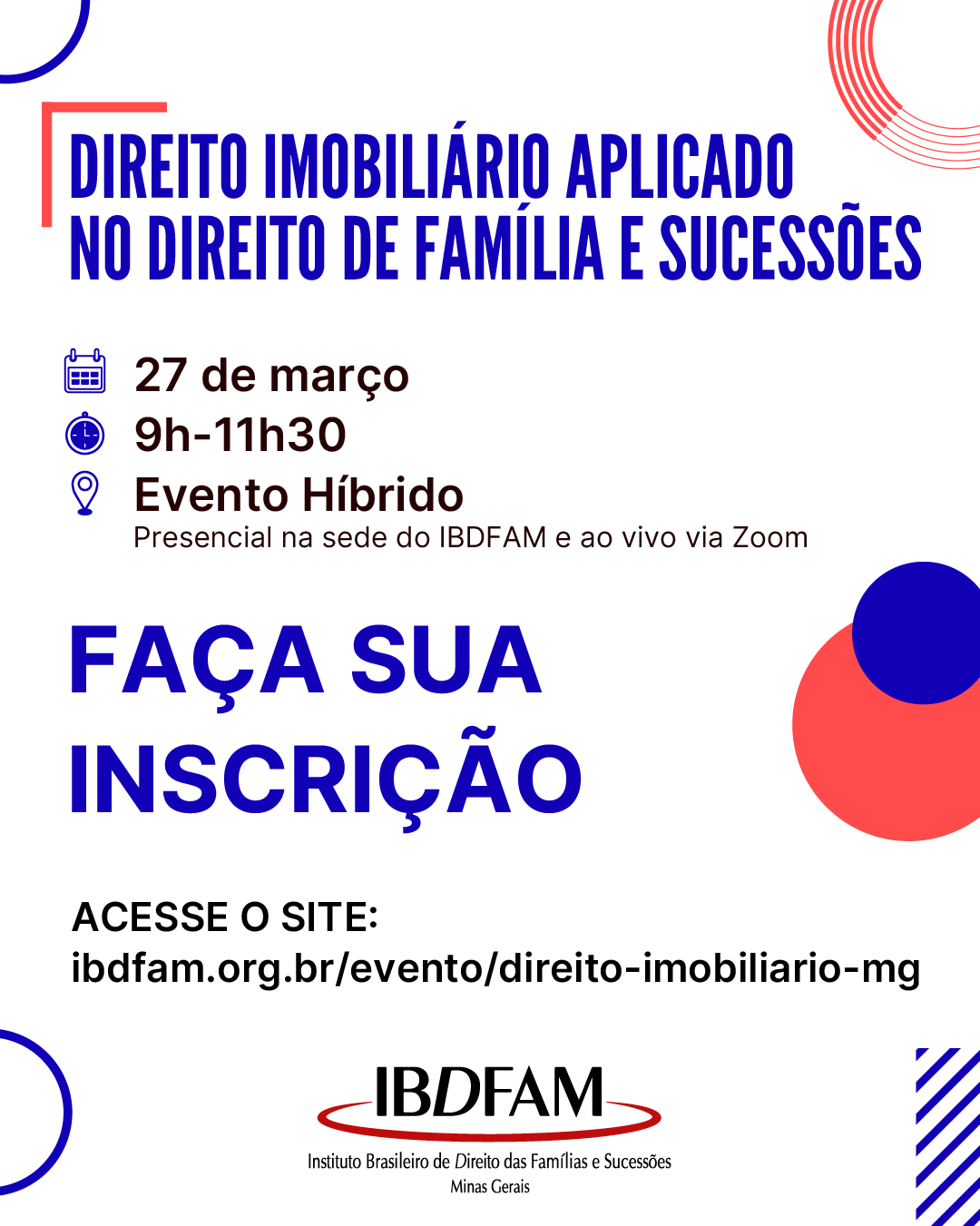 Inscrições: https://ibdfam.org.br/evento/direito-imobiliario-mg/