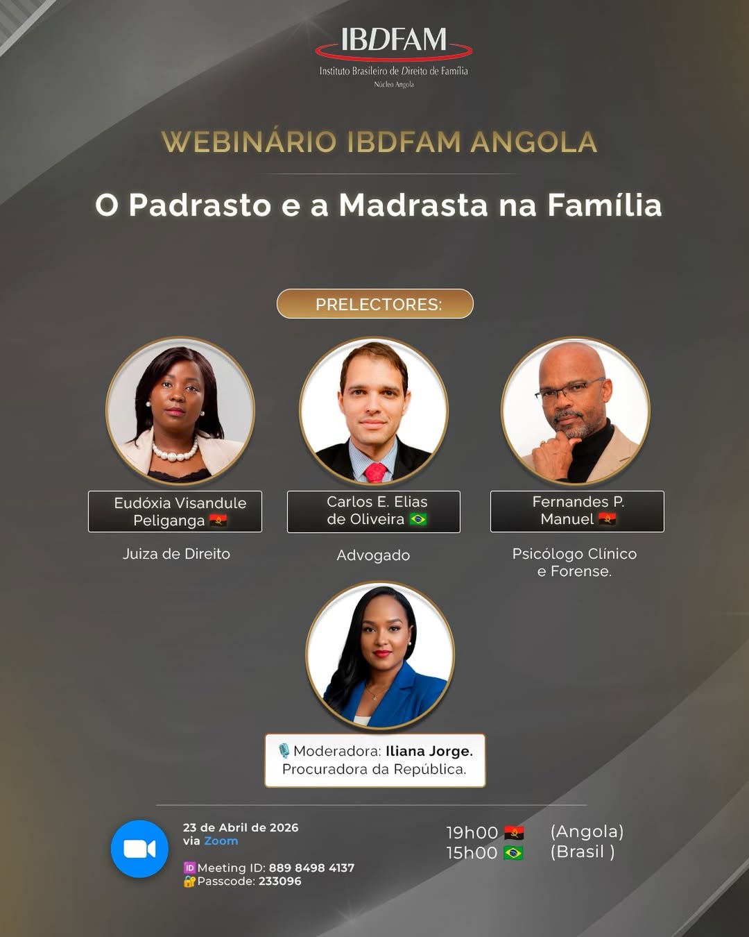 O webinário, promovido pelo Núcleo Angola do IBDFAM, acontece via Zoom, às 19h (horário local de Angola) e às 15h (horário do Brasil).