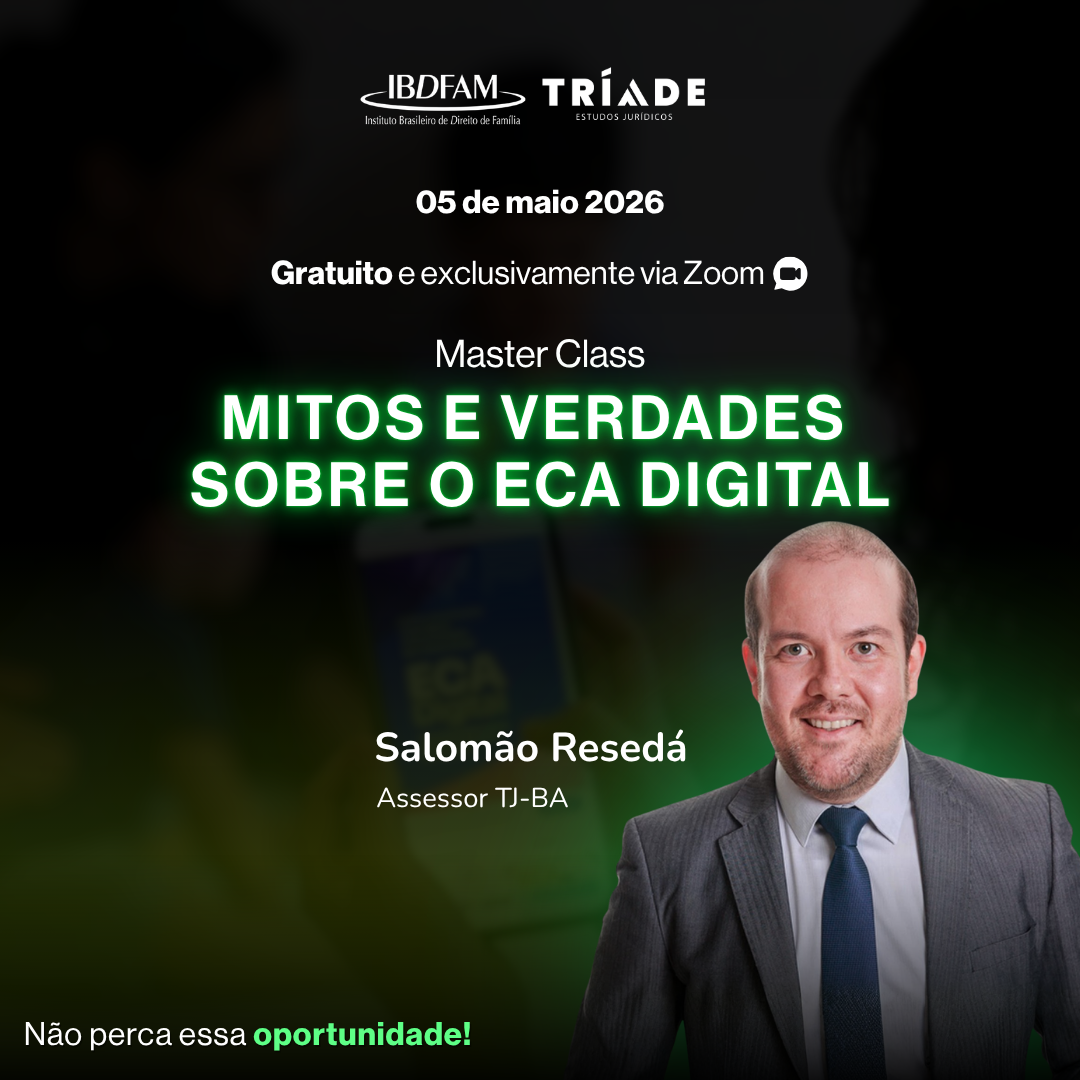 A masterclass gratuita, promovida pela Tríade Estudos Jurídicos em parceria com o IBDFAM, acontece no dia 5 de maio, às 19h, via Zoom. Ao todo, serão nove encontros ao vivo, com aulas interativas e aprofundadas.
