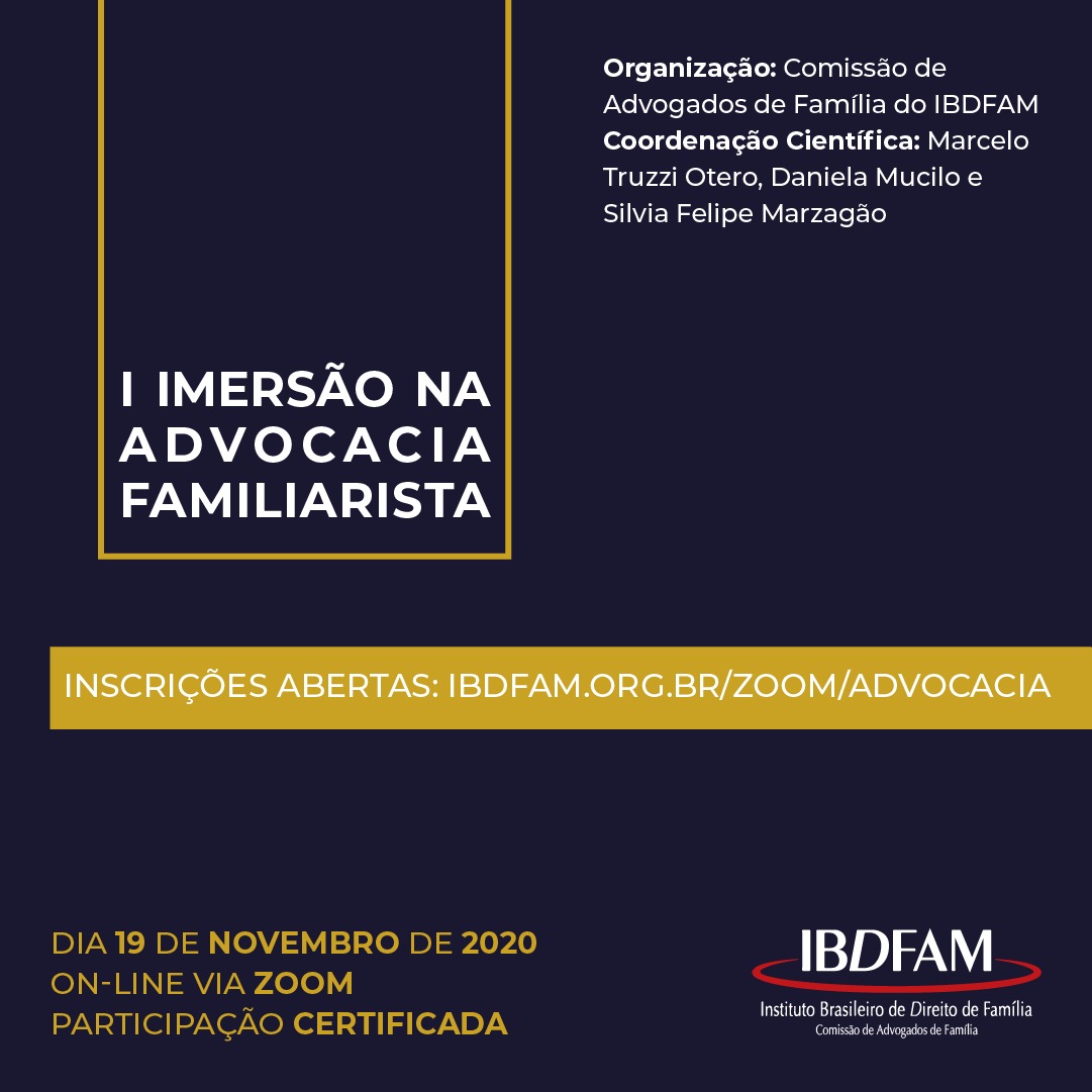 On-line via Zoom. Participação certificada. Organização: Comissão de Advogados de Família do IBDFAM. Coordenação Científica: Marcelo Truzzi Otero, Daniela Mucilo e Silvia Felipe Marzagão.