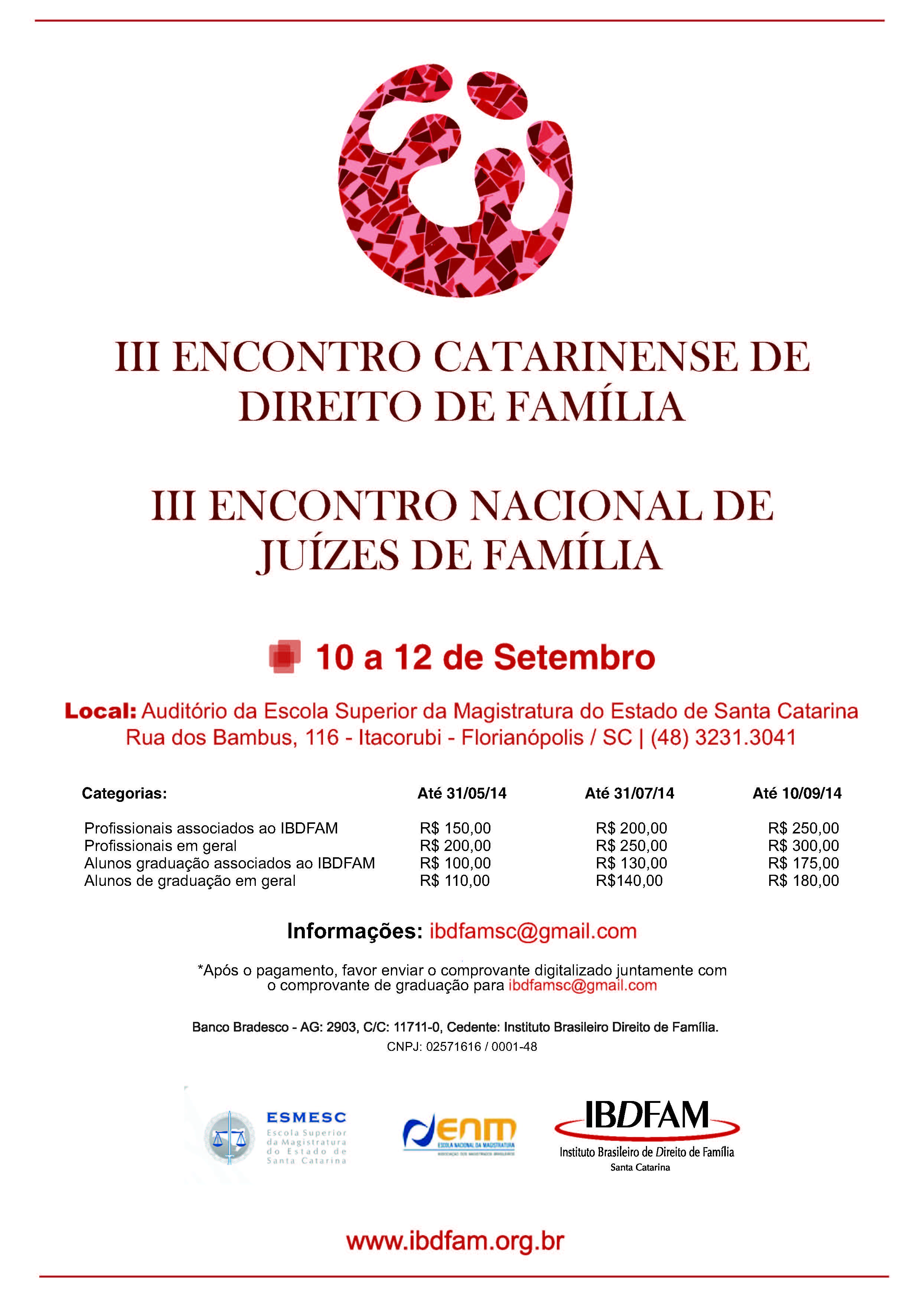O III Encontro Catarinense de Direito de Família será realizado em Florianópolis (SC), nos dias 10,11 e 12 de setembro de 2014, no Auditório da Escola Superior da Magistratura do Estado de Santa Catarina. O endereço é Rua dos Bambus, 116, Bairro Itacorubi.