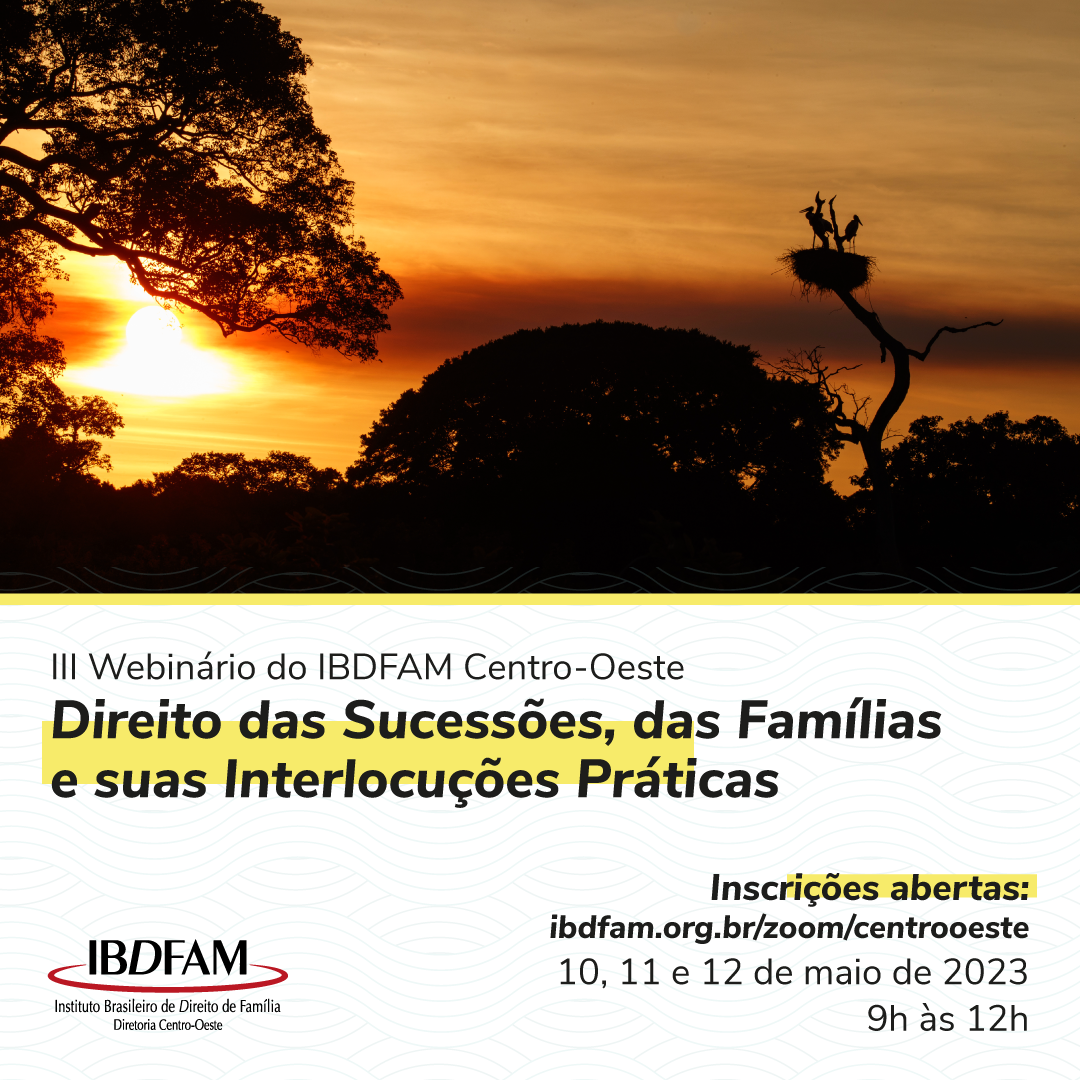 Temas caros ao Direito das Famílias e das Sucessões serão discutidos por especialistas durante o III Webinário do IBDFAM Centro-Oeste: Direito das Sucessões, das Famílias e suas Interlocuções Práticas. O evento será transmitido por meio da plataforma Zoom, entre os dias 10, 11 e 12 de maio. Participe!