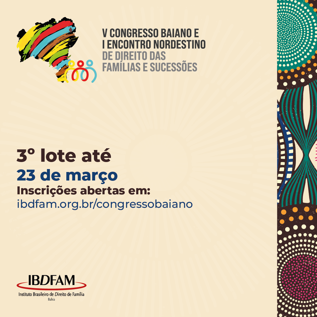 O V Congresso Baiano e I Encontro Nordestino de Direito das Famílias e Sucessões, promovido pelo Instituto Brasileiro de Direito de Família, seção Bahia – IBDFAM-BA, marcado para os dias 24, 25 e 26 de abril, terá palestra exclusiva sobre “Famílias Monoparentais Femininas e Alimentos”. O tema será analisado pela vice-presidente da Comissão de Direito e Arte do IBDFAM, Luciana Brasileiro.