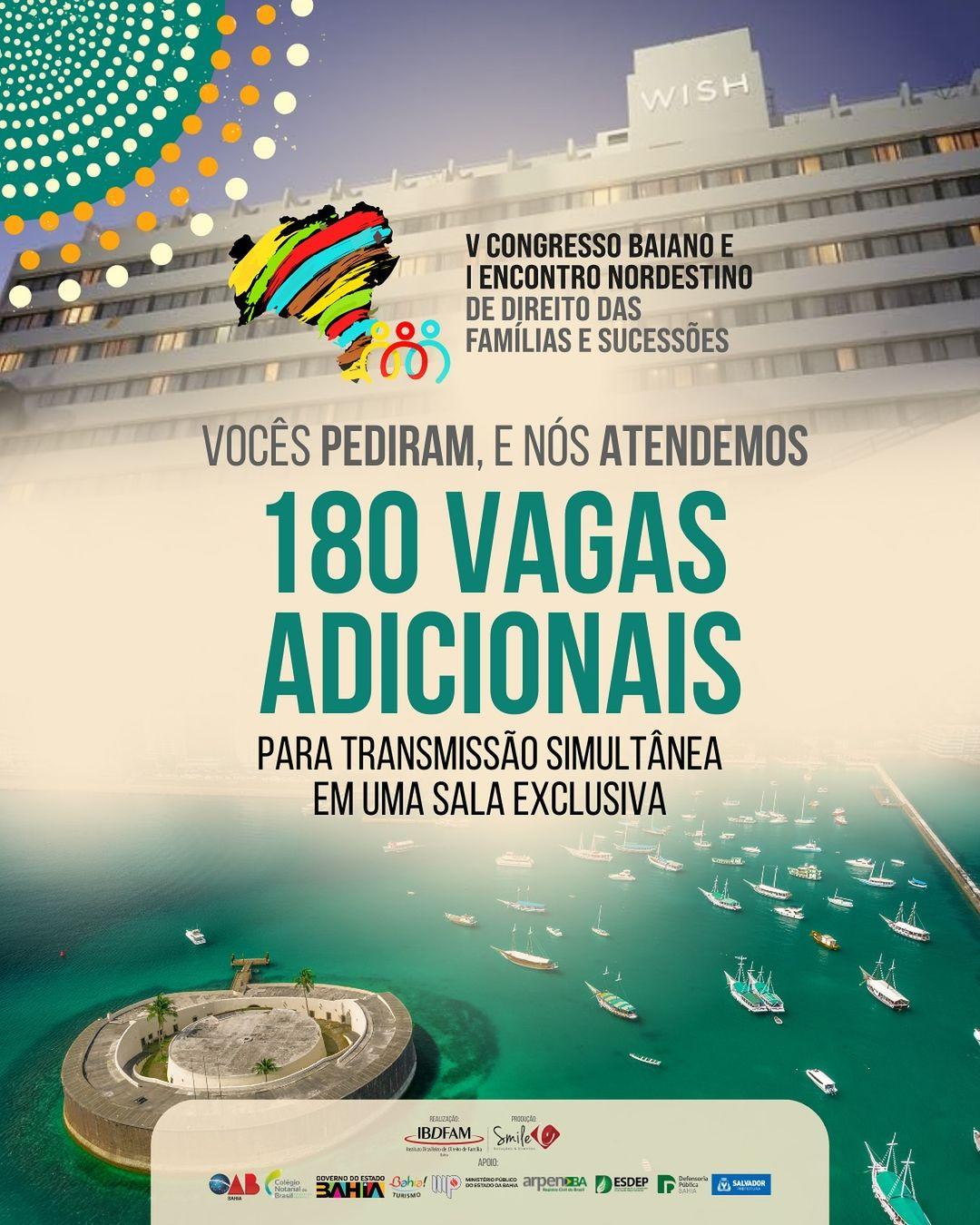 O V Congresso Baiano e I Encontro Nordestino de Direito das Famílias e Sucessões abriu inscrições para as vagas de transmissão simultânea presencial. Nesta modalidade, os congressistas acompanham o evento in loco, no Hotel Wish da Bahia, em Salvador, nos dias 24, 25 e 26 de abril, por meio de um telão, em uma sala exclusiva. As vagas para o auditório principal estão esgotadas.