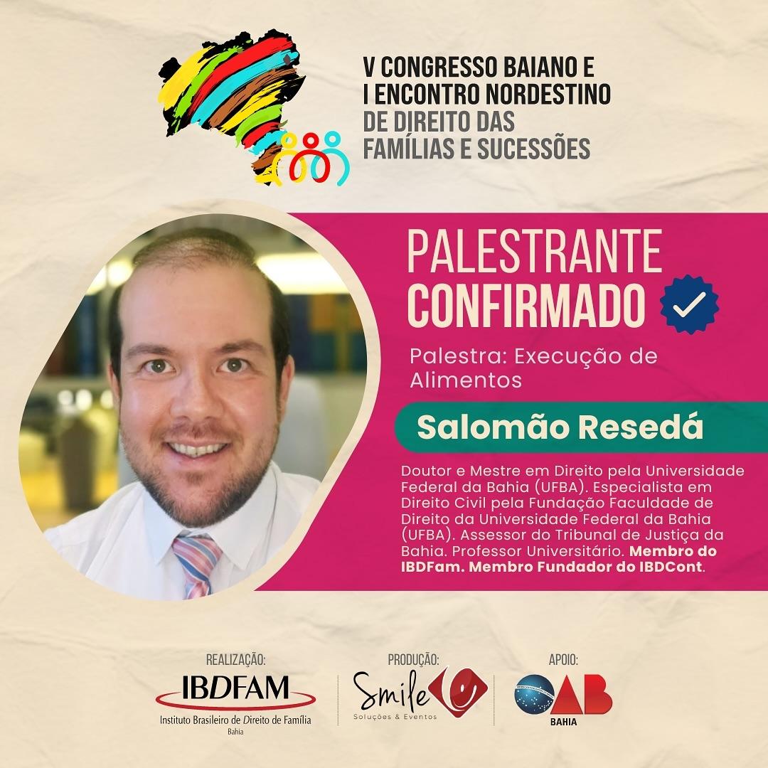 O professor Salomão Resedá irá debater a execução de alimentos durante o V Congresso Baiano e I Encontro Nordestino de Direito das Famílias e Sucessões. O evento acontece nesta quarta (24), quinta (25) e sexta (26), em Salvador. Estão abertas as inscrições para a transmissão simultânea.