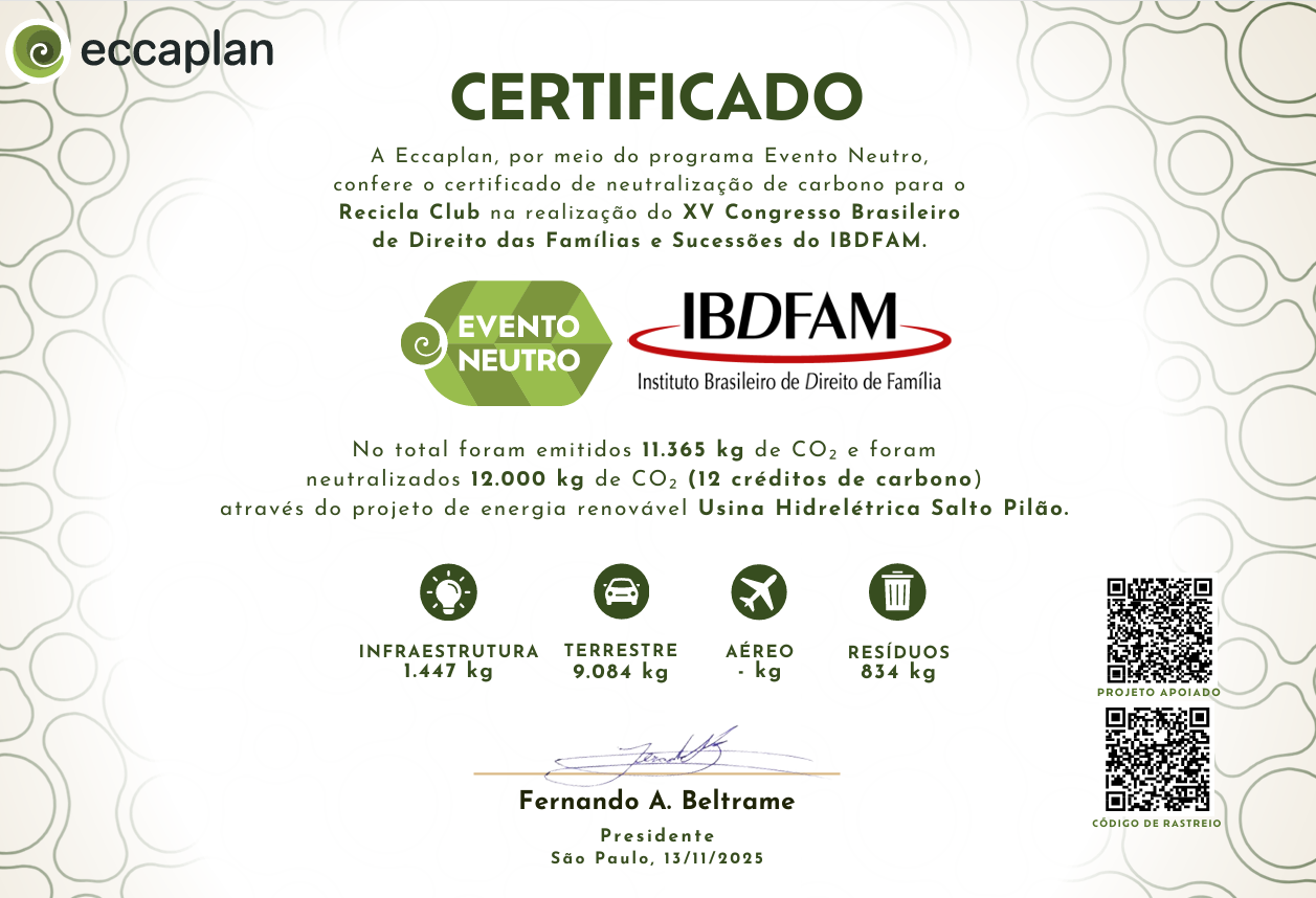 A ação foi certificada pela Eccaplan, por meio do programa “Evento Neutro”, que reconheceu o compromisso ambiental do Instituto Brasileiro de Direito das Famílias e Sucessões – IBDFAM, com apoio da empresa Recicla – contratada para a gestão ambiental do Congresso.
