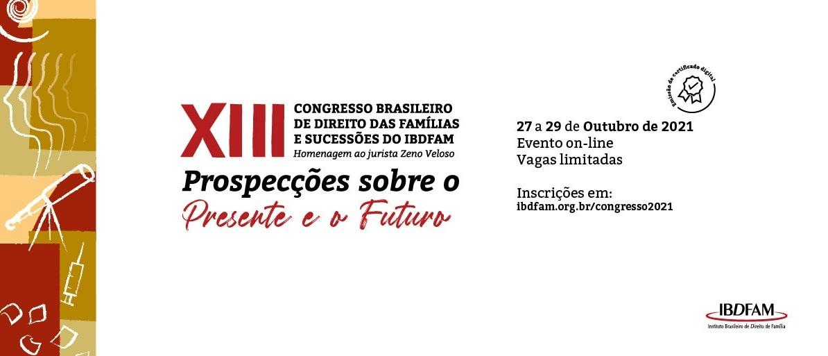 A programação do XIII Congresso de Direito das Famílias e Sucessões, totalmente on-line, reúne temas emergentes na sociedade contemporânea, com abordagens de especialistas nas áreas. O evento é uma iniciativa do Instituto Brasileiro de Direito de Família – IBDFAM e está marcado para os dias 27, 28 e 29 de outubro. As vagas são limitadas: clique aqui e garanta a sua participação.