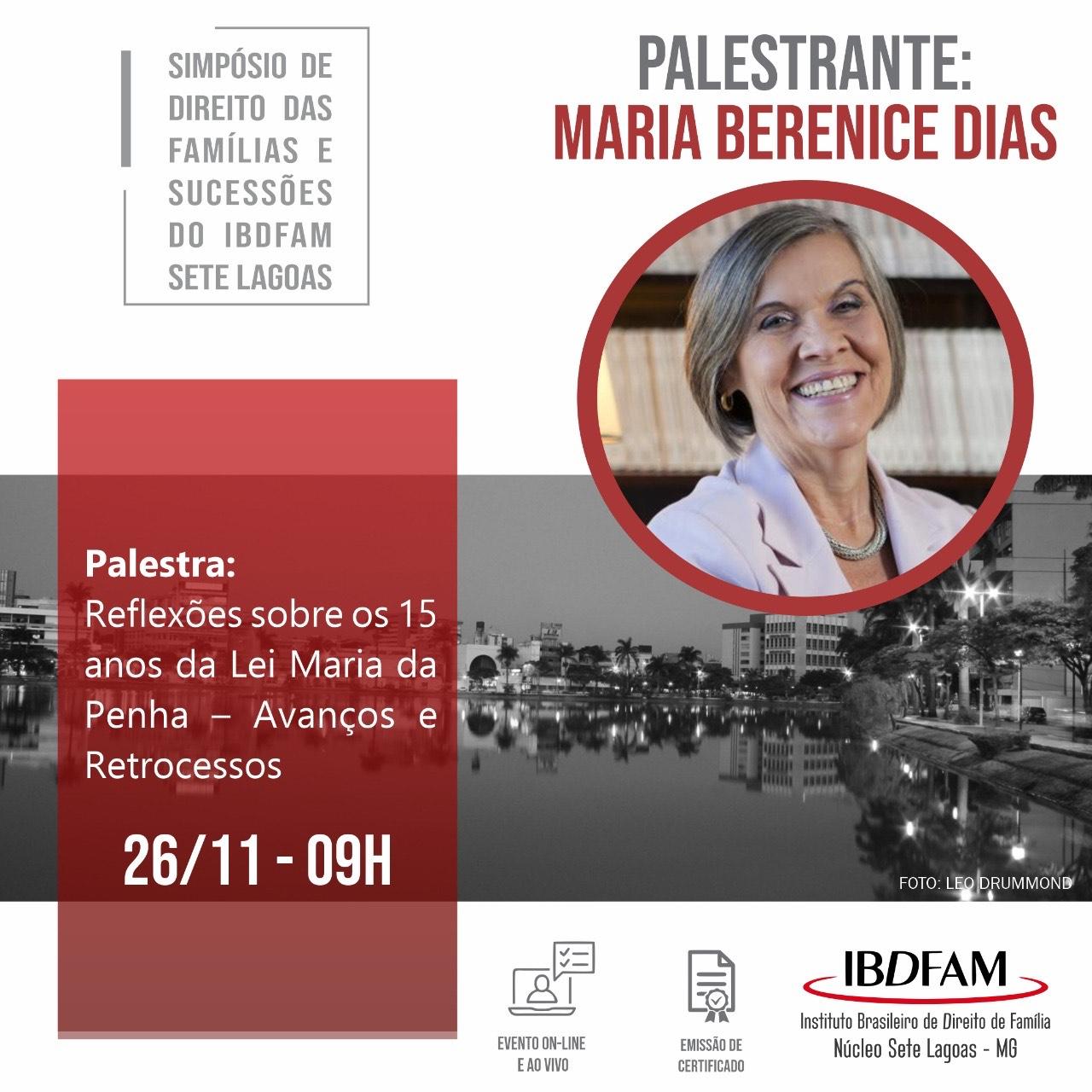 A advogada Maria Berenice Dias, vice-presidente do Instituto Brasileiro de Direito de Família - IBDFAM, marca presença na programação do Simpósio de Direito das Famílias e Sucessões do IBDFAM Sete Lagoas. A palestra será sobre os avanços e retrocessos nos 15 anos da Lei Maria da Penha (11.340/2006).